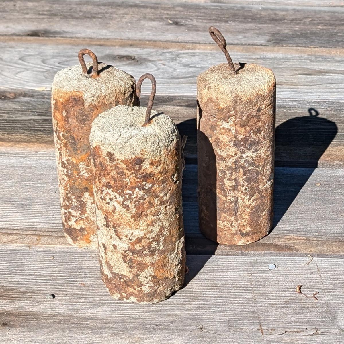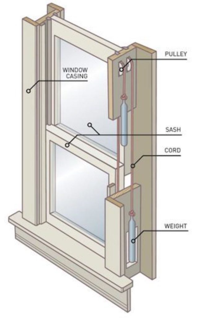 You see, windows did not work then the way they do today. A double-hung sash window was composed of a top sash and a bottom sash, two weights [iii]These were salvaged from a building on the Patchen property – concrete cast in tin cans. connected by cords to each sash with pulleys, the sill at the bottom, and a casing to hold the whole thing together.